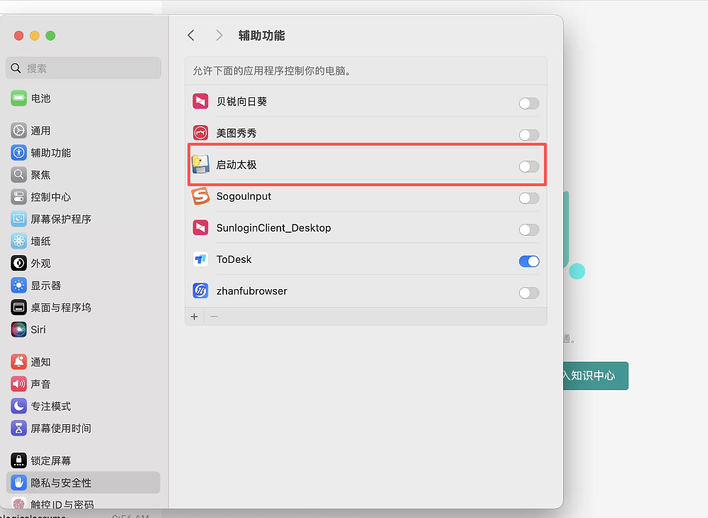 运行后需要授权,在隐私和安全性中找到辅助功能,找到启动太极,打开开关即可