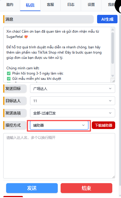近期收到很多朋友反馈,有些店铺无法正常私信达人,发送私信的时候请不要使用鼠标,挂着页面让它自己完成即可,另外我们提供了一款辅助器,可以协助操作